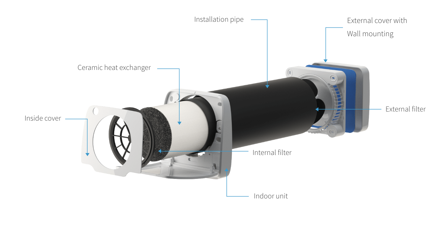 Mini rekuperatornsystemet samlar värme i den keramiska värmeväxlaren genom att dra ut luften. När cykeln ändras passerar den tillförda utomhusluften genom den uppvärmda värmeväxlaren och värms upp, vilket ger varm och frisk luft tillbaka till rummen.